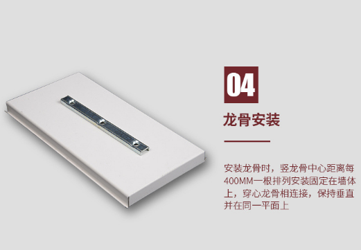 1、安裝龍骨時,豎龍骨中心距離每400mm一根排列安裝固定在墻體上,穿心龍骨相連接,保持垂直并在同一平面上。
